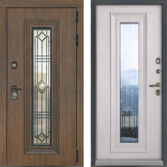 Цвет металла: Черный муар Внешняя отделка: МДФ панель 16 мм влагостойкая Дуб медовый + черная патина Декоративные МДФ наличники.